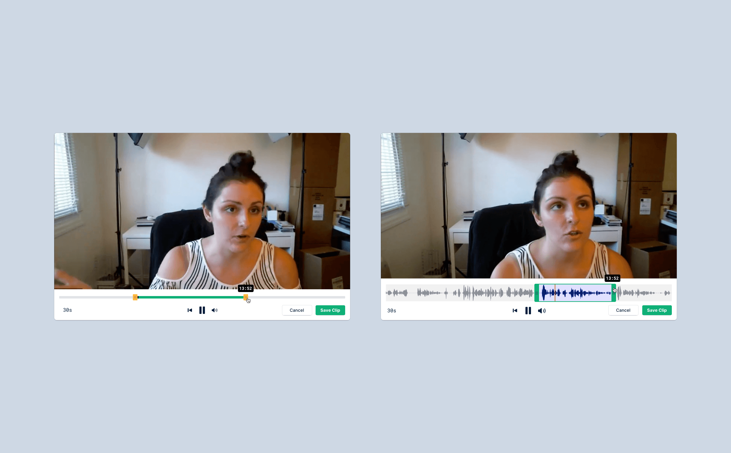 When it comes to editing clips, we tried a few common patterns like the examples below, but found that users were spending too much time tweaking the clip duration to make sure they were trimming the right content. Ultimately, we took some inspiration from an app called Descript and used the transcript provided by Zoom’s API as a way of trimming the content. This helped save users time, and interestingly could be done without audio or much transcript accuracy.