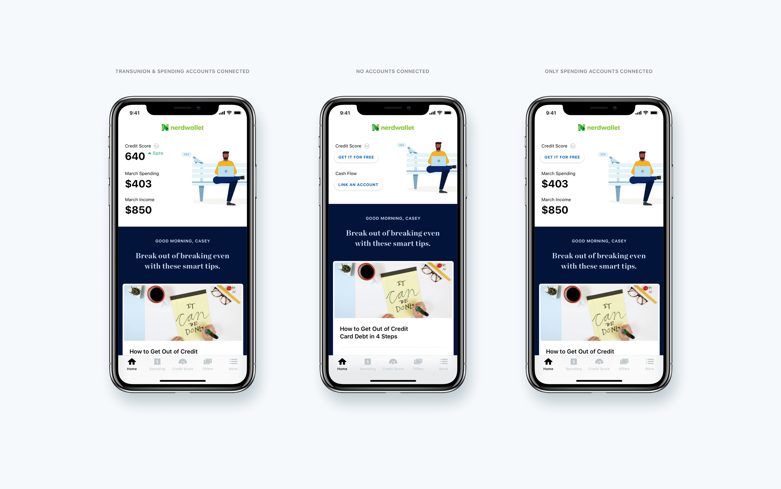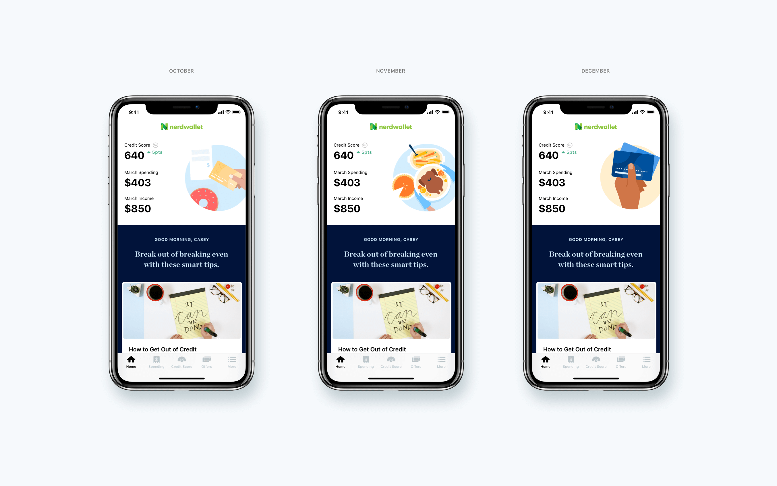 During this project, NerdWallet was at the tail end of defining their new brand expression; an effort led by the company’s creative team. This coincided perfectly with the mobile redesign, so we decided to apply it to our app. I worked with the creative team to develop NerdWallet’s brand in the context of the mobile app, making adjustments to typography and illustration style.