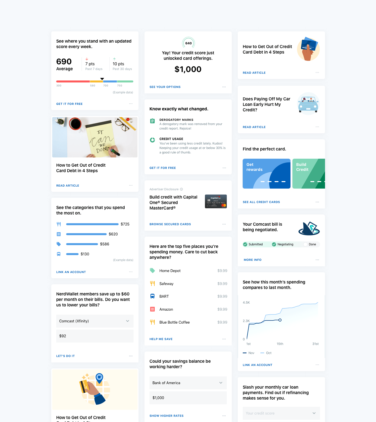 The feed is where users are given updates on changes to the various financial accounts they’ve linked, along with actions they can take to help improve their financial health. The cards in the feed act as entry points into other areas of the app, such as the credit score and spending dashboards, as well as financial articles, calculators, and product marketplaces.