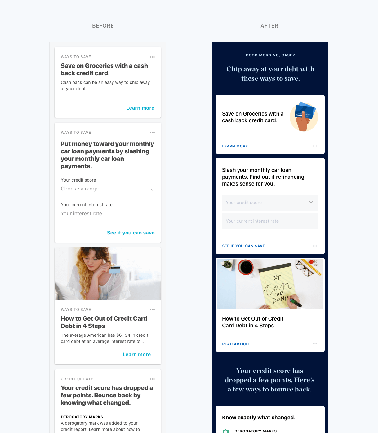 In order to alleviate these issues, I segmented the feed by categories like credit monitoring, spending and income, debt management, and more. At the top of each segment there’s a summary statement of the category’s current status. The statement eliminates the need for each card to set its own context, greatly reducing the amount of redundant text on the page, along with the work required to maintain it. It provided a better reading experience for the user, and gave them the ability to parse through the feed more efficiently.
